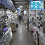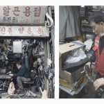 While almost no people walk the aisles in the upper floors of Sewoon Sangga, on the road level the scenery gets busier. Such as cars, motorbikes, cyclists, and small trucks navigating their way around pedestrians. Shop owners are standing around, drinking mixed-coffee from paper cups, or sitting in their shops explaining some technical details to one of their customers. Now and then, the deafening sound of a Korean song from the 80s signals someone is testing a karaoke machine.