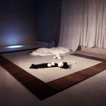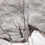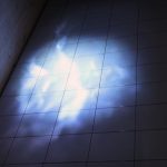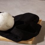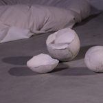 “HER” is a poetic space installation. Fruits made of plaster are located inside a wooden square. The forms are damaged in some places, the edges of the mold are visible, the pieces are not aligned. One of the forms is halved and its mass has flowed out of its shell. A white textile is hanging from the ceiling, from which a blanket grows. There is a wrinkled torso on the bed. The back of the installation is paved with white tiles. On it there is a projection of the light beam on the waves. There is a flower taped to the wall, a few white petals have fallen to the ground. There is also a glass vase filled with water on the floor. On the other side of the projection there is a blue towel and a blue color card.